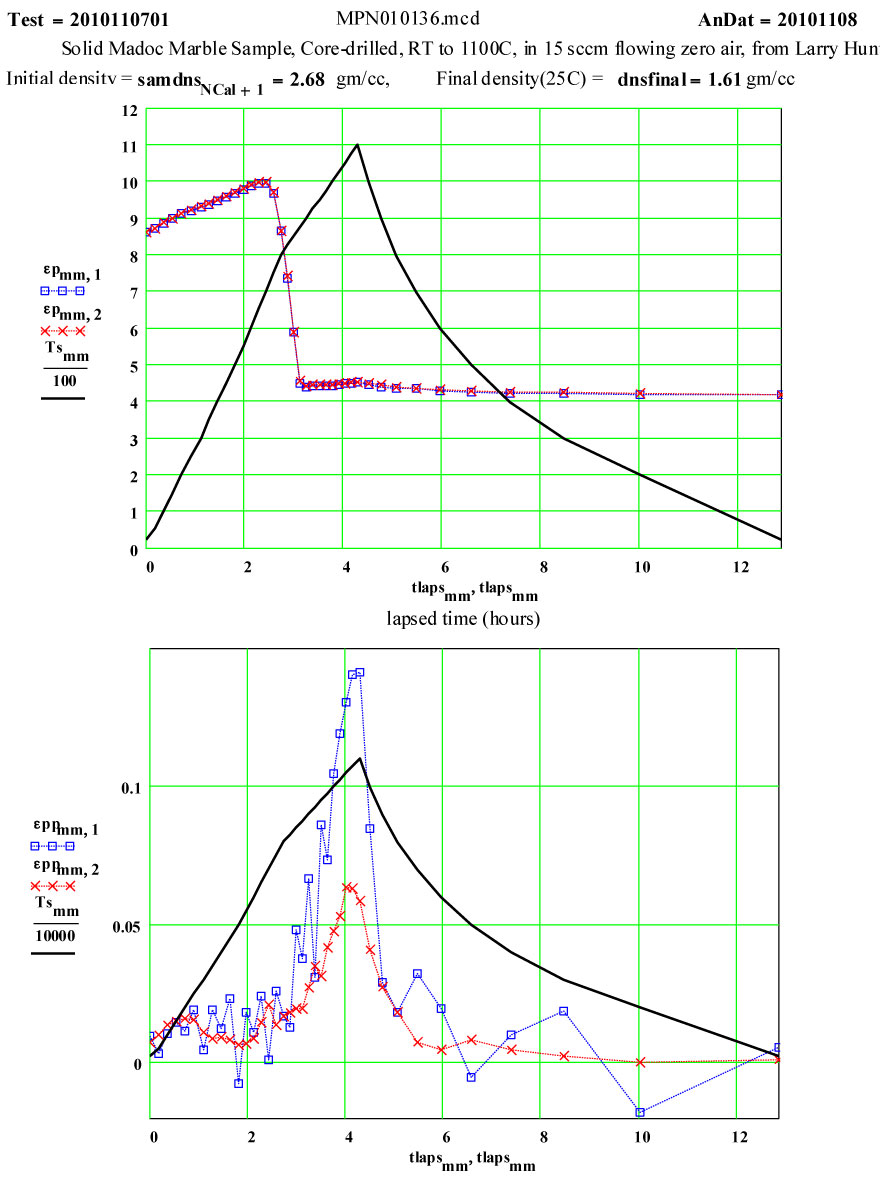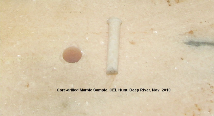 Sample Description: The sample was “Madoc Marble” ( slightly beige/pink – see picture), acquired by Dr. CEL (Larry) Hunt of Deep River, Ontario, Canada. The measurement sample was made by diamond core-drilling a large piece of solid marble. After cutting to length, the sample was baked for two hours at ~125C to drive off surface moisture.
